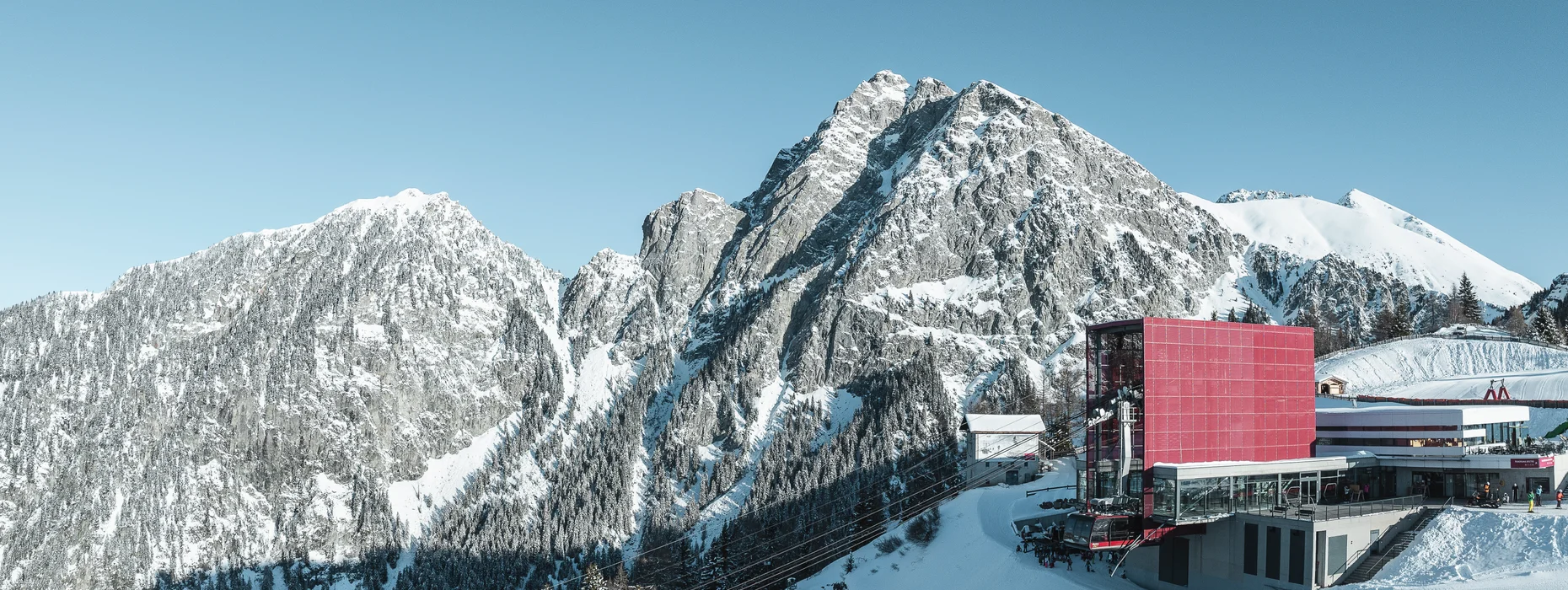Die Bergstation von Meran 2000 kann man mit zwei verschiedenen Aufstiegsanlagen erreichen: von Meran aus mit der Bergbahn und von Hafling aus mit der Umlaufbahn Falzeben.
