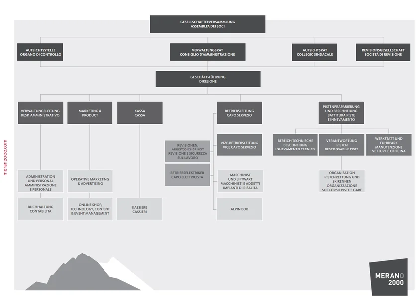 Die Aufsichtsstelle der Meran 2000 Bergbahnen AG hat im Organisationsmodell nach GvD 231/2001 alle Werte und Gesetze als Grundlage des unternehmerischen Handelns dargestellt, an das sich alle Gesellschafter, Arbeitnehmer:innen, Mitarbeiter:innen und Stakeholder halten müssen. Das Organisationsmodell nach GvD 231/2001 wird laufend verbessert und weiterentwickelt.