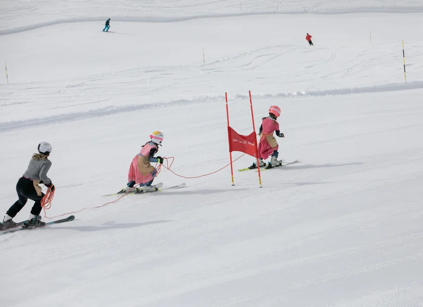 Der vordere Rennläufer fixiert ein Seilende am Körper, das beim mittleren Rennläufer durch einen Karabiner locker durchläuft. Der hintere Rennläufer regelt mit den Händen die restliche Seillänge.