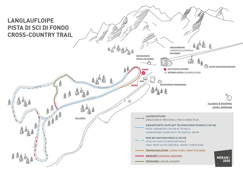 Der gemäßigte Schwierigkeitsgrad und die herrlichen klimatischen Bedingungen auf Meran 2000 machen die Loipe in Falzeben zu einem idealen Rundkurs für Einsteiger, Kinder und Genusslangläufer. Die Loipe ist sowohl für Skating als auch für den klassischen Langlauf geeignet.