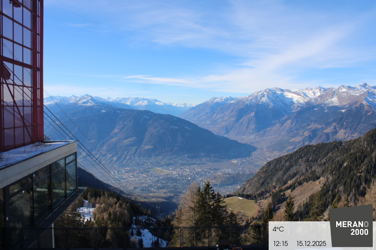 Oben umgibt dich ein 360°-Panorama, der Blick reicht bis zum Kalterer See im Süden Südtirols, ins Sarntal, zu den Gipfeln des Passeiertals, der charakteristischen Skyline der Dolomiten, sogar bis zum Ortler, den höchsten Gipfel Südtirols und Meran mit seinen Tälern.