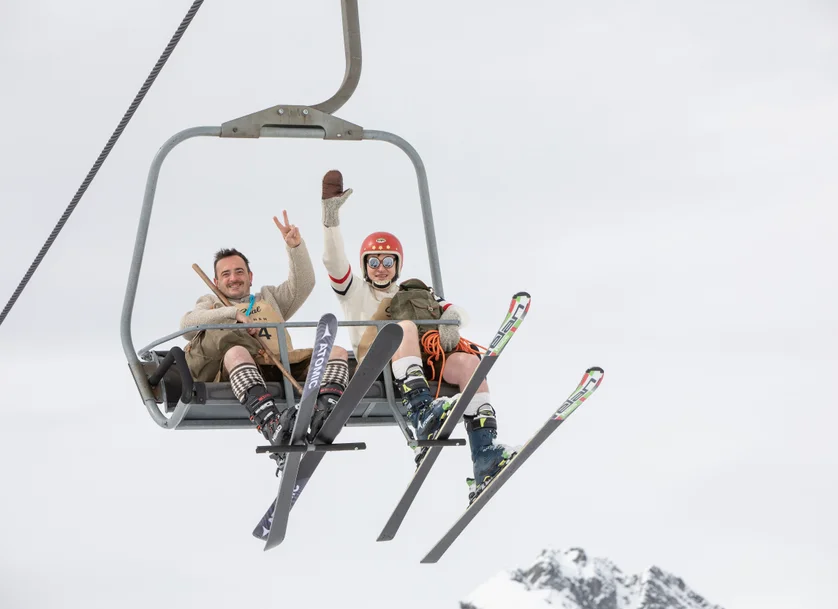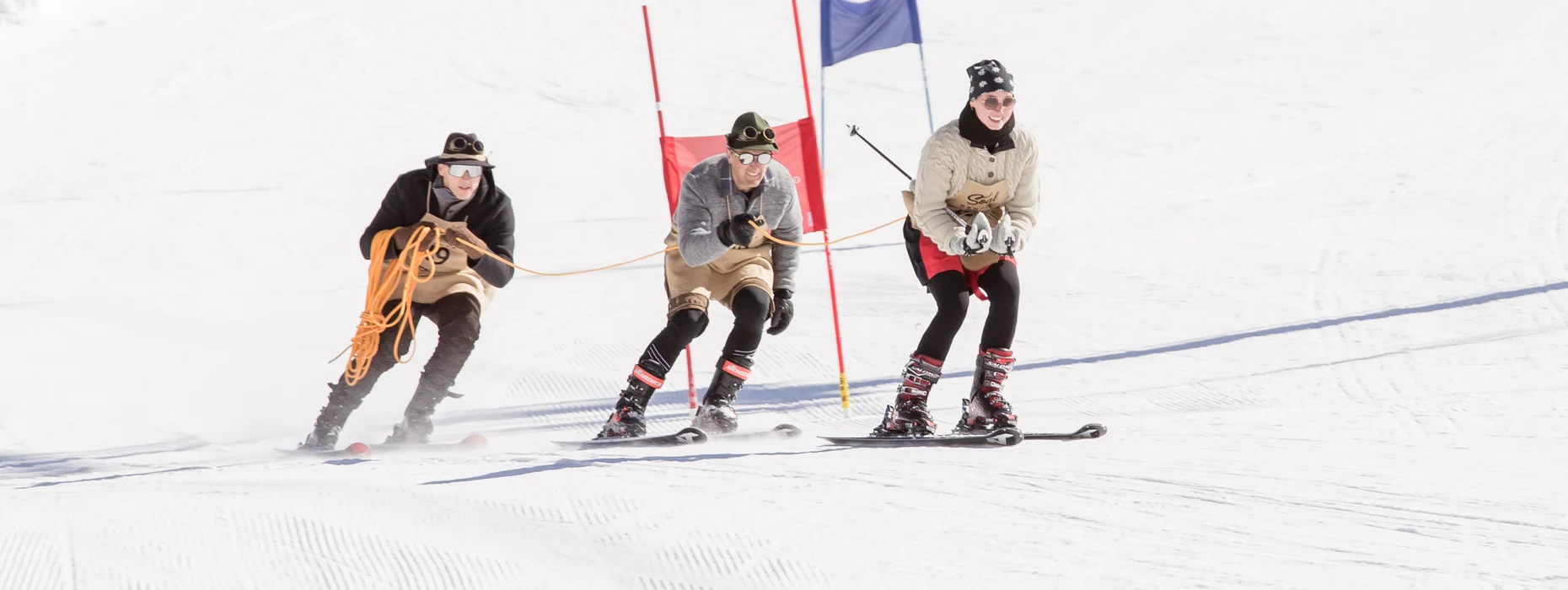 Bei Sonnenschein und in kreativen Ski-Outfits mit Retro-Charme traten die angemeldeten Seilschaften in den Kategorien „Die Großgewordenen" oder „Die Lauser" an. In 3er-Teams und verbunden mit einem Seil, galt es für die Rennläufer eine einfache Riesentorlauf-Strecke zu bewältigen, um gemeinsam die Ziellinie zu erreichen.