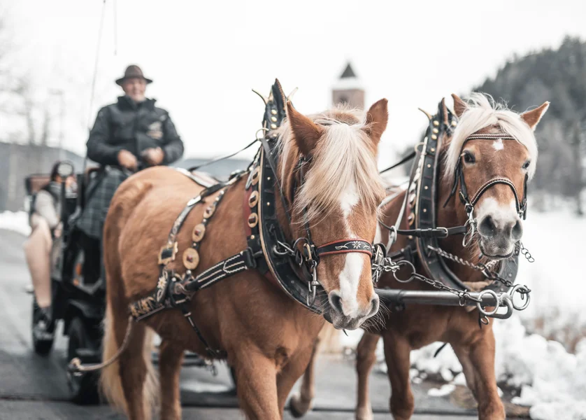 Eine Genuss-Kombination zwischen der VIP Gondel Meran 2000, begleitet von Champagner und Häppchen und einer Kutschenfahrt mit Haflinger Pferden.
