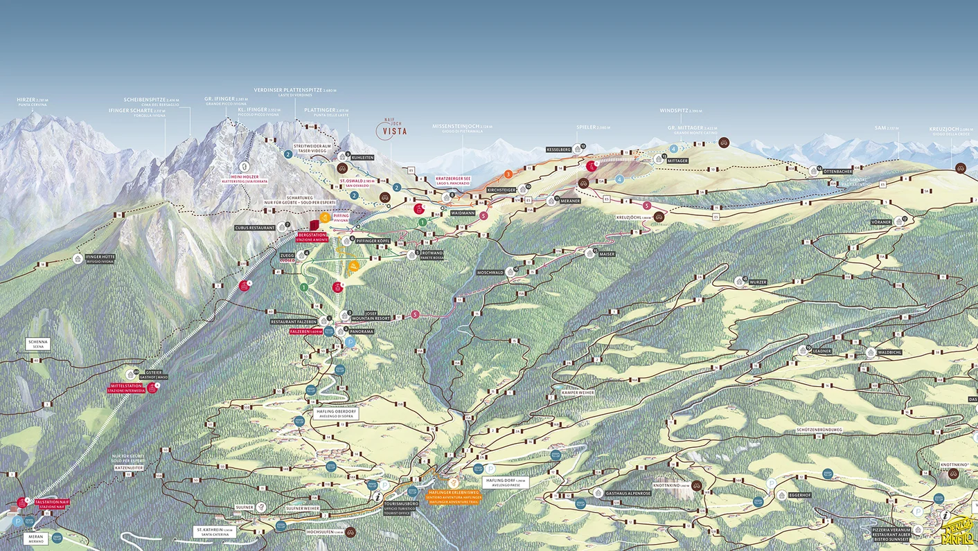 Scopri facilmente i sentieri, i punti panoramici, le cime, i rifugi e le attrazioni di Merano 2000 sulla nostra cartina del comprensorio.